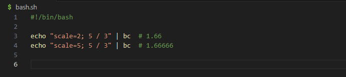 echo "scale=5; 5 / 3" | bc # 1.6666