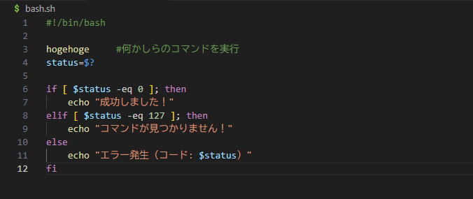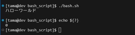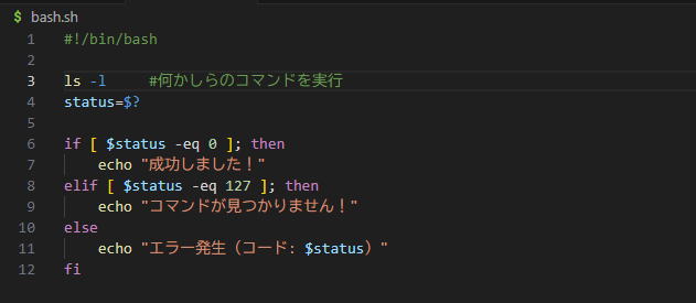まだ、if文とか説明してないけど、こんなように使います。$?は直前のコマンドが正常終了したかのステータスが