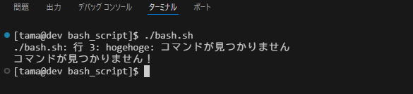 3行目でコマンドがみつかりません になっていますね!ちなみにエラーを出力してスクリプトは終了していますので