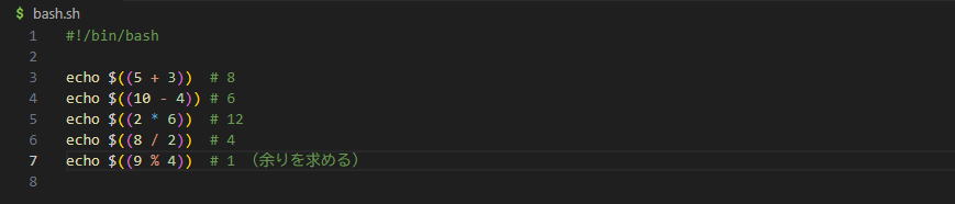 数値の計算は$(( )) を使用します。これは 算術式展開と呼び、数値演算を実行できます。