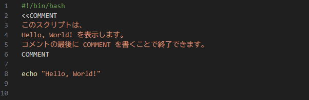 もしくは、 echo "Hello World" #コメントで、#以降がコメントとして扱われます。
